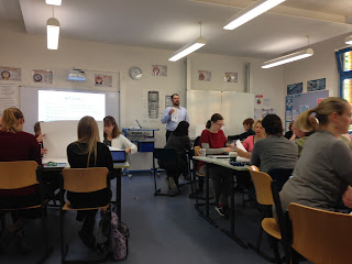 Después nos han invitado a un claustro algo peculiar o al menos a nosotras nos lo ha parecido ¿ por qué ? Pues los claustros se realizan de forma cooperativa, esto quiere decir que todo el equipo docente confecciona los proyectos , actividades, etc …la opinión de todos es el resultado final del proyecto. Personalmente nos ha parecido muy enriquecedor. Un café nos ha ayudado a cargar pilas y a continuar con el día. ¿Os acordáis que ayer os contábamos que el cole es multicultural? Pues dos veces por semana separan a los alumnos según su lengua materna para así no dejar de practicarla ¿no os parece increíble ?. Pues de la misma forma que integran sus lenguas maternas también refuerzan las lenguas oficiales del colegio, pues como imaginaréis son el inglés y alemán.